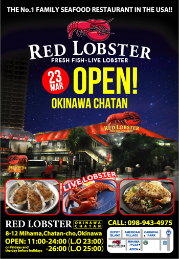 2012年3月23日、北谷町美浜のデポアイランド向かいに、沖縄2号店となる「レッドロブスター 沖縄北谷店」がオープン。メイン州のリゾート地「バーハーバー」にある海辺のレストランをイメージした店内は、船のランタンやデカール類がリゾート感をより一層盛り上げる「バーハーバースタイル」。世界中のシーフードを始め、本格アメリカンシーフードがリーズナブルに楽しめるレストランだ。
