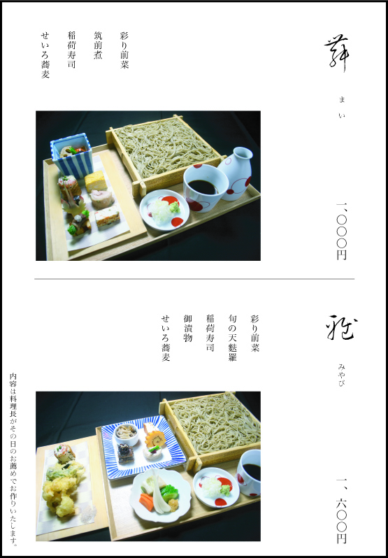 『蕎麦切 宮下 三田綱町』 2種のランチ限定メニュー 『舞』 ~まい~ 1000円 彩の前菜 小煮物 一口稲荷寿司 せいろ 『雅』~みやび~ 1600円 彩の前菜 お漬物 旬菜の天ぷら 一口稲荷寿司 せいろ 14時までご入店の方限定のランチメニュー 蕎麦切 宮下ならではの昼食はちょっと足を延ばしても 食べてお得感があるランチだ! 土・日・祝もこのランチを食べられるのが嬉しい。 PR |
